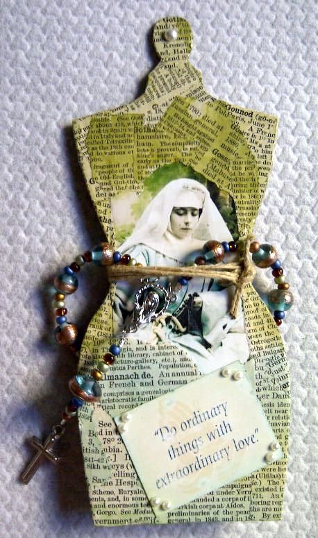 rtist. Her creativity knows know bounds. When I saw her dress form, I was hoping I would be the lucky recipient of it. I love nuns and I love how she created this masterpiece. And the quote by Mother Theresa is apt and beautiful. Dena carefully layered the dress form with torn vintage print and coloured it delicately as well. I love my dress form more than you will ever know, Dena.Lara is a good friend of Dena's. I was blown away by her work. I called it the Iron Maiden dress. All silver and black, it is dark, brooding and futuristic. And it resonates with me. Lara is a trifter and the dress form came wrapped up in a vintage doily. Lara also decorated the back of the dress form with a cool velvet sticker which continues on the theme. Her other work were just as stunning and also vastly different.